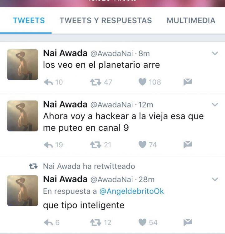 Ante la serie de tweets malintencionados que se publicaron desde su cuenta, los periodistas de El Trece TV se comunicaron con Awada para indagar sobre lo sucedido: "Me hackearon Twitter. Me quiero morir" respondió, furiosa, dejando en claro que no fue ella la de los mensajes. Además, agregó que está haciendo lo posible para denunciar a la persona que entró a su perfil.