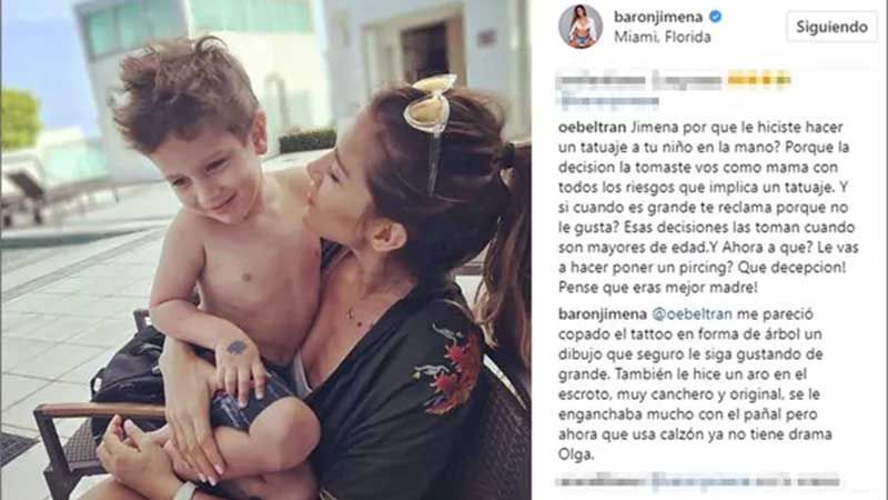 Lejos de enojarse, la actriz y cantante se tomó el comentario con mucho humor y le respondió irónicamente: "Me pareció copado el tattoo en forma de árbol, un dibujo que seguro le siga gustando de grande. También le hice un aro en el escroto, muy canchero y original, se le enganchaba mucho con el pañal pero ahora que usa calzón ya no tiene drama, Olga".