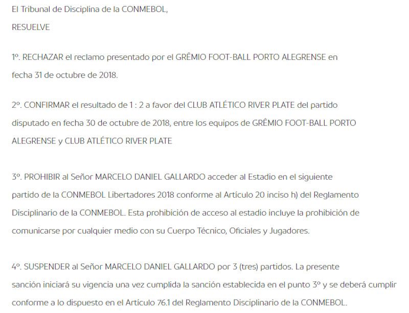Conmebol dio a conocer el fallo en donde desestima el pedido de Gremio y confirma que River es el finalista de la Copa Libertadores y se enfrentará a Boca el 10 y 24 de noviembre.