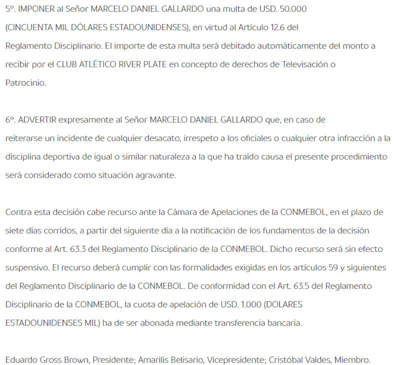 Con respecto al técnico Millonario, Marcelo Gallardo, también se confirmó su sanción que será de 4 partidos luego de haber incumplido la fecha de suspensión ante Gremio e ingresado al vestuario en el entretiempo.