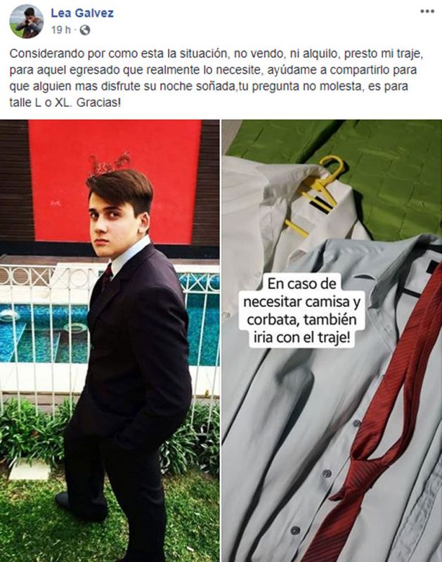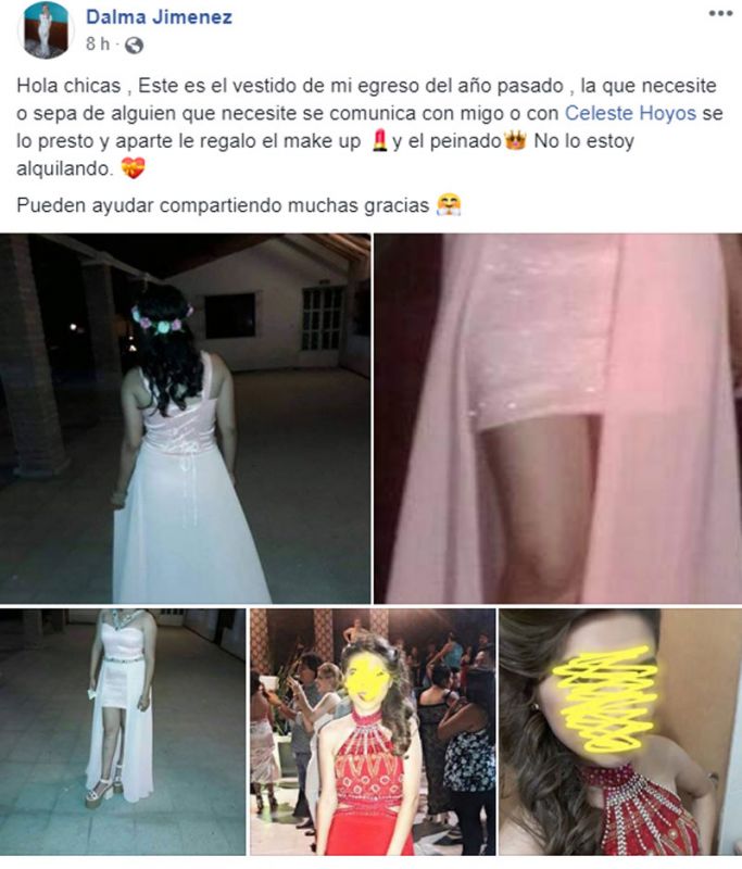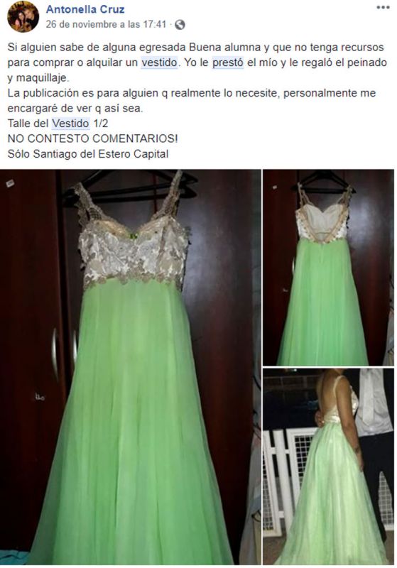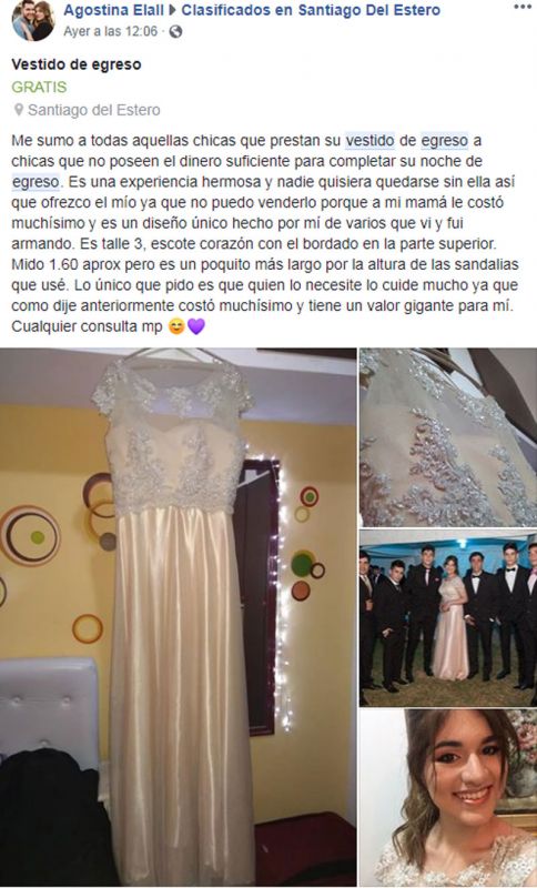 "Yo también me uno a la campaña solidaria para que las chicas puedan cumplir sus sueños de egresadas! Les presto mi vestido a quien lo necesite ya que sé de los momentos difíciles que estamos pasando", publicó Yésica, una joven santiagueña en Facebook.