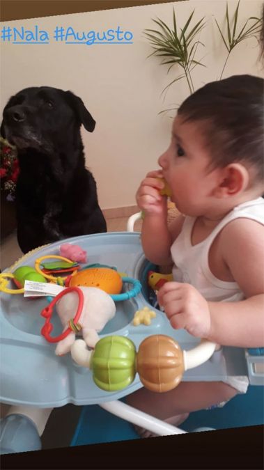 En su cuenta de Instagram, Romina subió a sus historias una imagen de Augusto, su hijo y ahijado del jugador, junto a Nala, la labradora negra que acompañaba desde hace un tiempo a Emiliano en Francia.