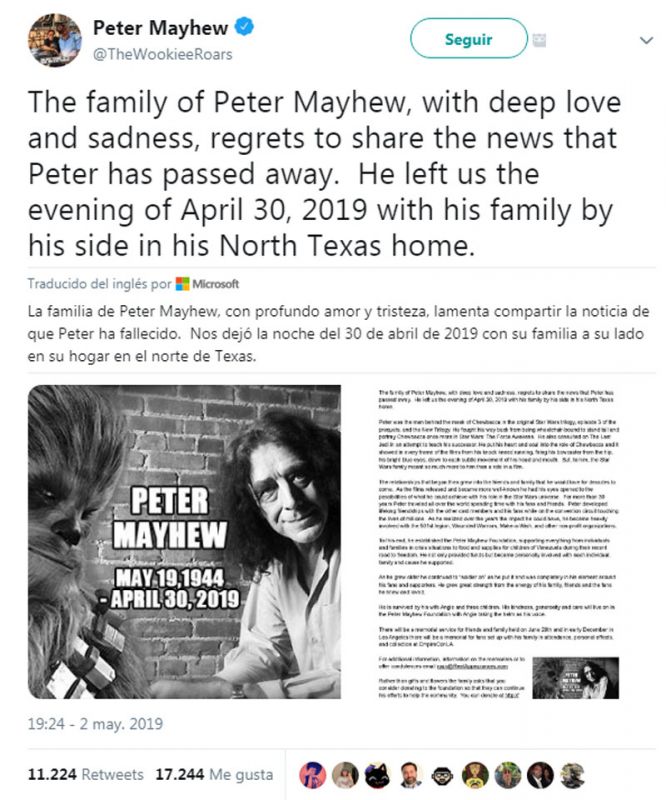 Peter Mayhew falleció el 30 de abril en su casa en Texas, su familia dio a conocer la noticia este jueves en su cuenta de Twitter.
