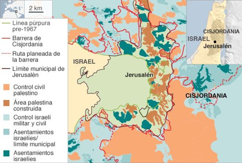 Jerusalén: Israel reclama soberanía sobre la ciudad (sagrada para judíos, musulmanes y cristianos) y asegura que es su capital tras tomar Jerusalén Oriental en 1967. Eso no es reconocido internacionalmente. Los palestinos quieren que Jerusalén Oriental sea su capital.