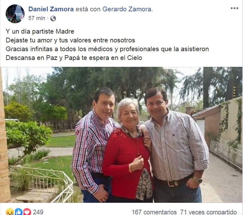 El diputado Daniel Zamora despidió a su madre Inés, que falleció este sábado a la tarde en un sanatorio de esta Capital.