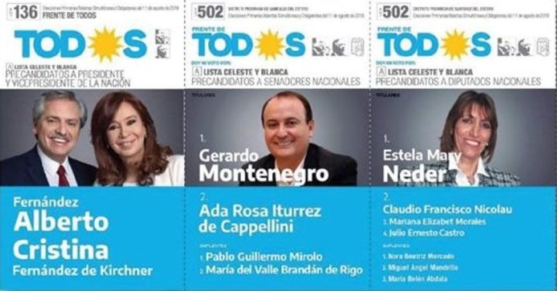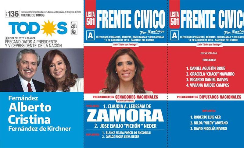 En Santiago, la fórmula presidencial Alberto Fernández-Cristina Fernández es apoyada por el gobierno provincial a través del Frente Cívico por Santiago, que postula a la ex gobernadora y esposa del mandatario, Claudia Abdala Ledesma, y al vicegobernador y presidente del PJ provincial, José Emilio “Pichón” Neder.