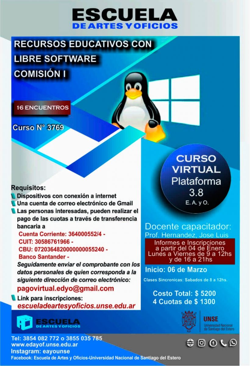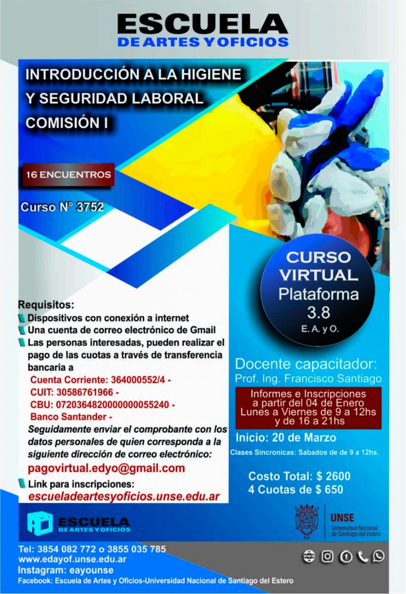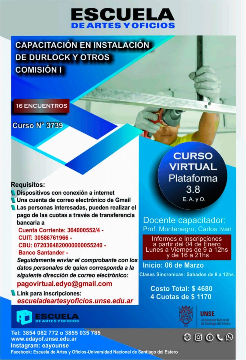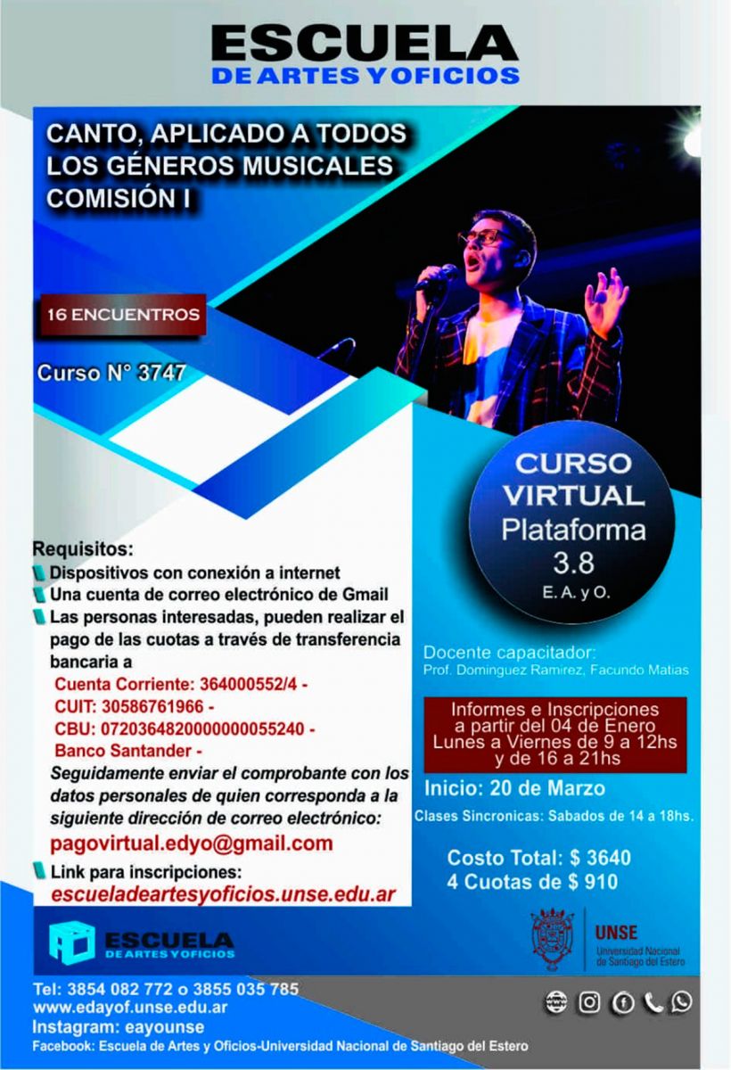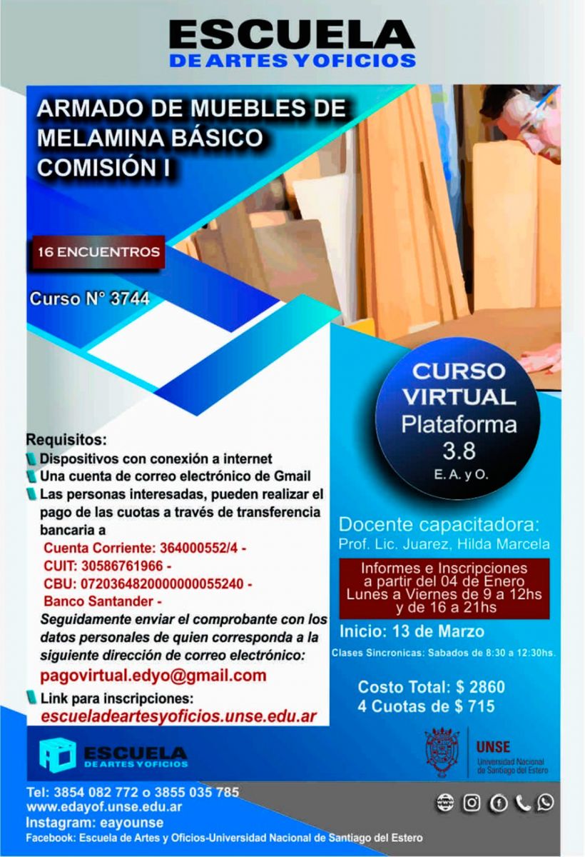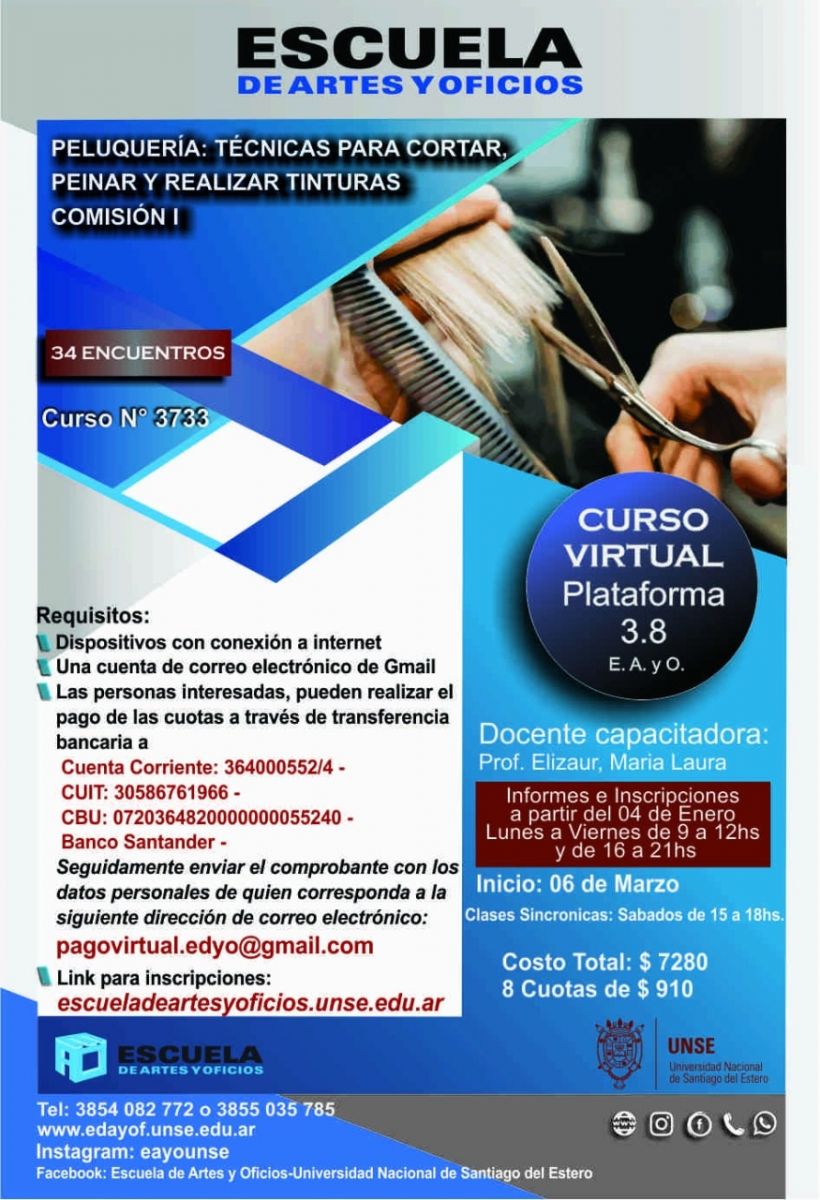 La Escuela de Artes y Oficios de la Universidad Nacional de Santiago del Estero informa a toda la comunidad provincial que se encuentran abiertas las inscripciones de la oferta de cursos y capacitaciones vigentes.