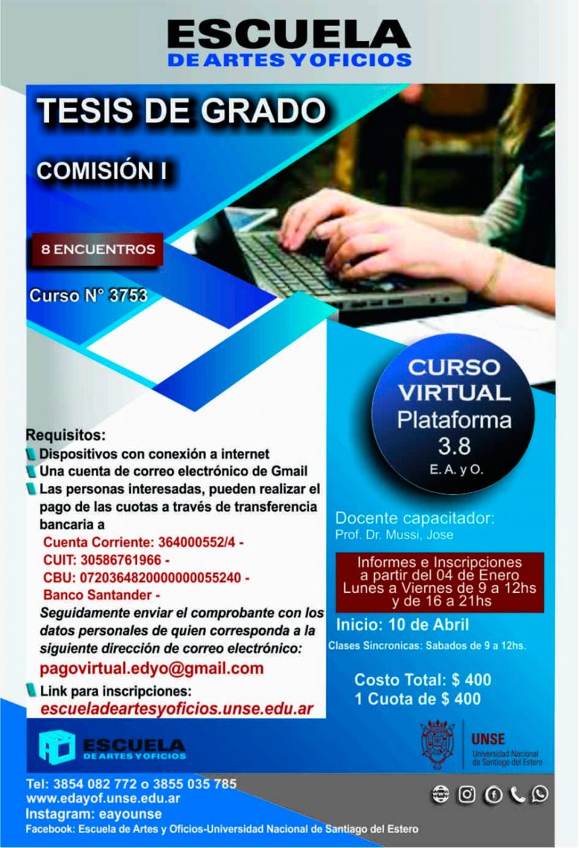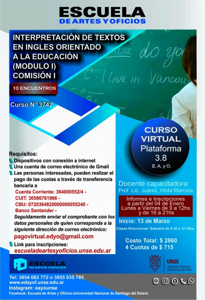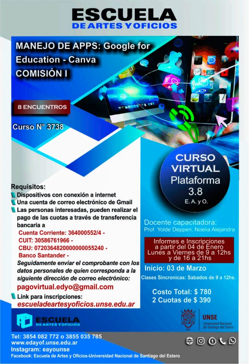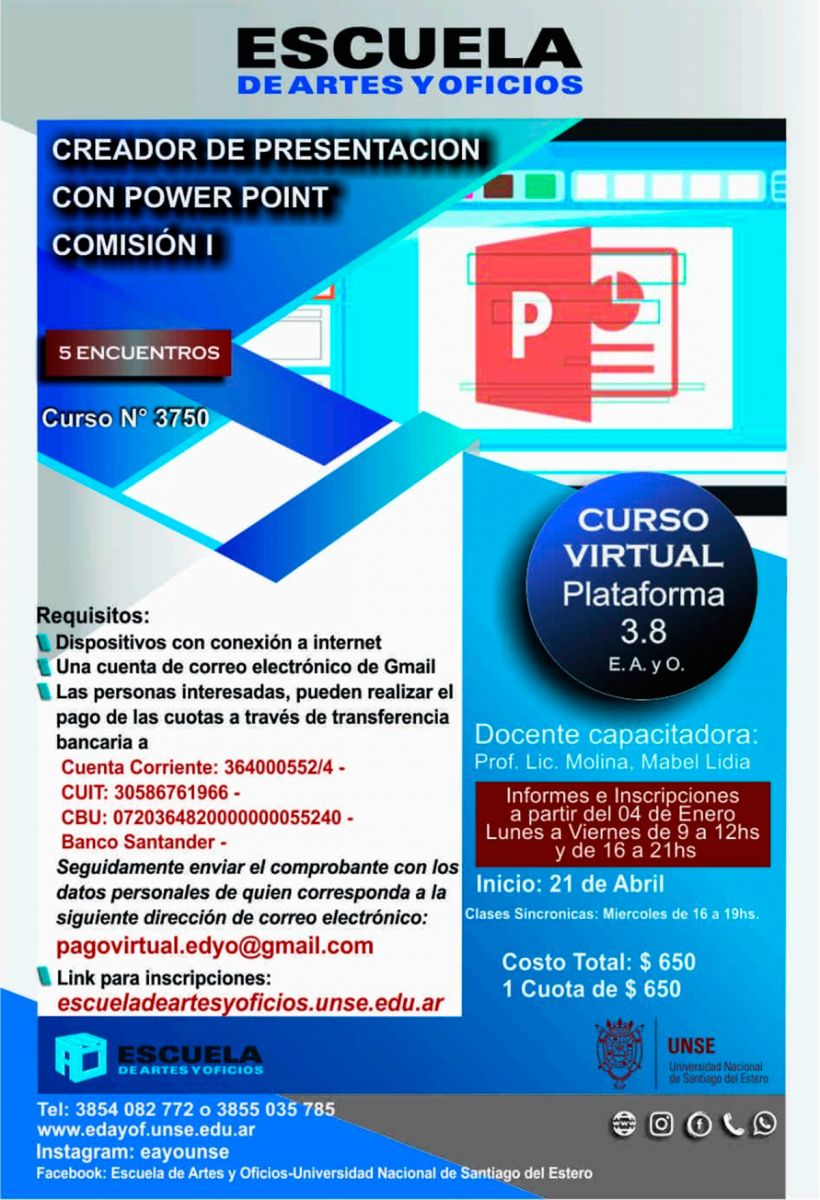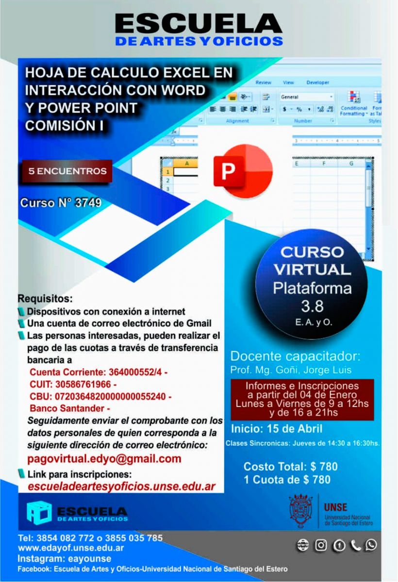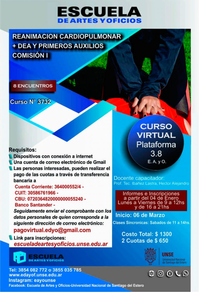 La Escuela de Artes y Oficios de la Universidad Nacional de Santiago del Estero informa a toda la comunidad provincial que se encuentran abiertas las inscripciones de la oferta de cursos y capacitaciones vigentes.