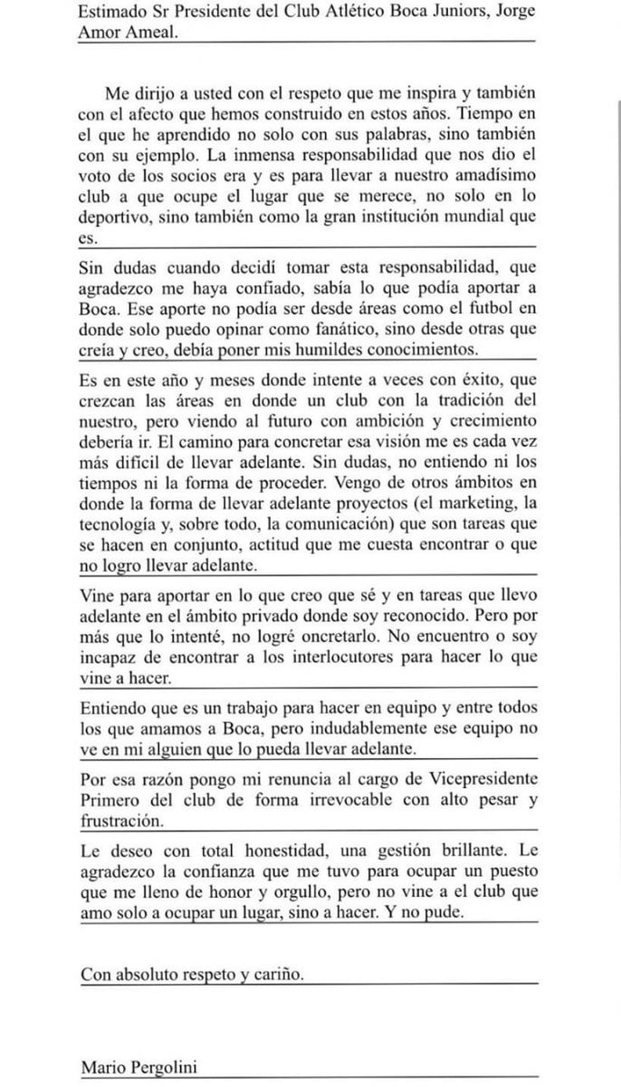 "Vine a aportar en lo que creo que sé y en tareas que llevo adelante en el ámbito privado donde soy reconocido. No encuentro o soy capaz de encontrar a los interlocutores para hacer lo que vine a hacer. Entiendo que es un trabajo para hacer en equipo y entre todos los que amamos a Boca, pero indudablemente ese equipo no ve en mí a alguien que lo pueda llevar adelante", prosiguió. "Por esa razón pongo mi renuncia al cargo de Vicepresidente Primero del club de forma irrevocable con alto pesar y frustración. No vine al club que amo sólo a ocupar un lugar, sino a hacer. Y no pude", concluyó.