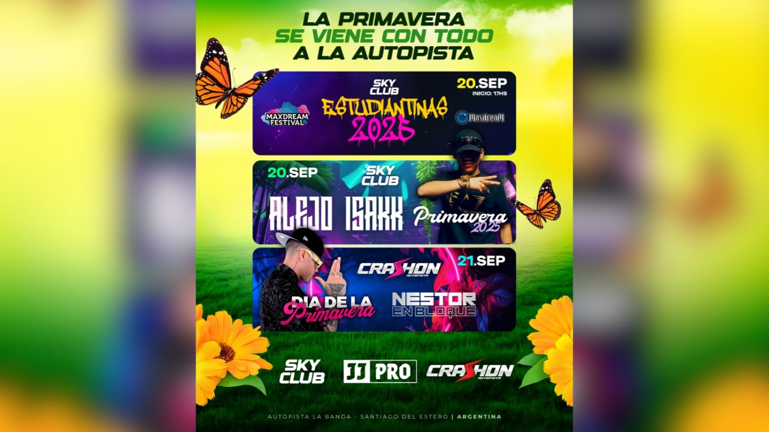 La primavera se instala con todo en Santiago del Estero y los eventos más esperados del año ya están aquí. Después de una temporada invernal llena de recitales con artistas de renombre, los locales Sky Club y Crashon Autopista te invitan a una apertura de temporada con una agenda que promete noches de fiesta y grandes espectáculos. Además, Diario Panorama tiene sorteos de accesos y pueden participar a través de su cuenta oficial de Instagram: @diariopanoramasde.