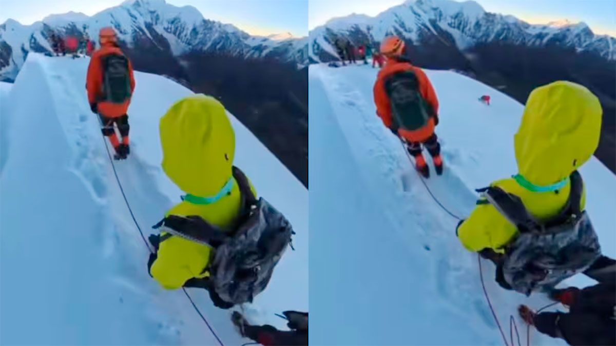 En las imágenes se puede ver que el alpinista, vestido con una campera roja y pantalón negro, se soltó de la cuerda de seguridad de su cuerpo para sacarse una foto junto a los otros turistas. Fue entonces cuando se resbaló hacia el lateral derecho de Nama Peak, uno de los picos más altos del monte.