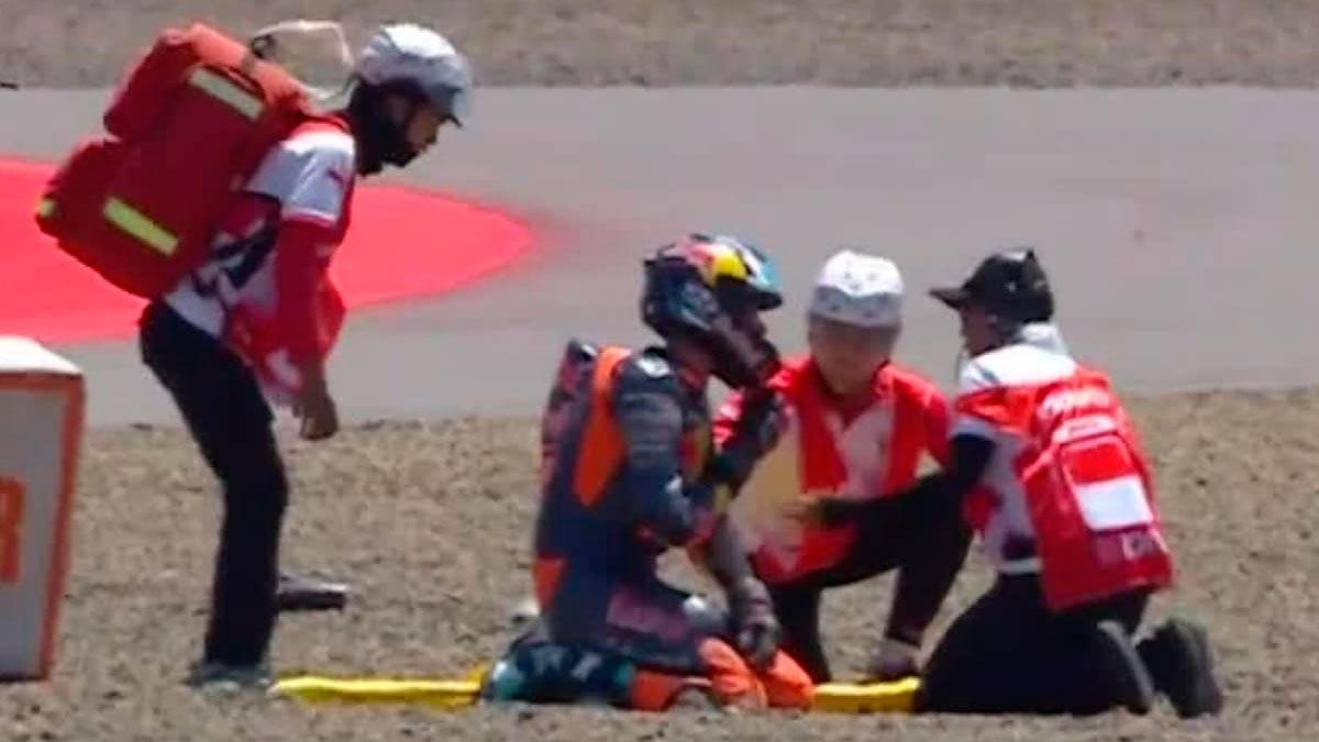 El piloto argentino de Moto3 fue embestido por el italiano Luca Lunetta en plena curva 11, salió despedido y quedó tendido en el piso. El primer parte médico llevó tranquilidad: está consciente, aunque seguirá en observación.