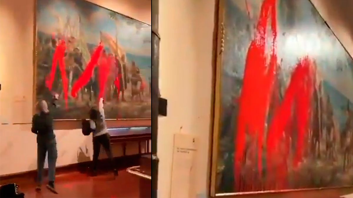 Activistas del colectivo ambientalista Futuro Vegetal lanzaron pintura roja "biodegradable" a un cuadro de Cristóbal Colón en el Museo Naval de Madrid (España) como protesta contra "siglos de opresión a la población indígena" en América.