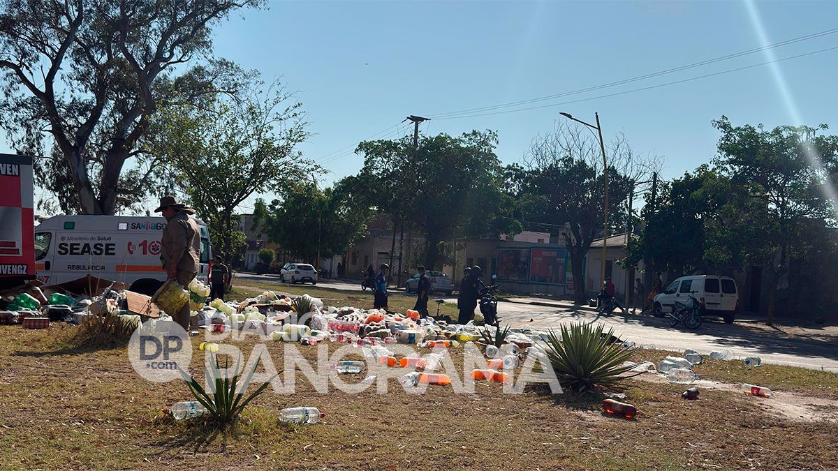 A raíz de la falla, el vehículo retrocedió varios metros sin control, hasta impactar contra un poste de alumbrado público. En medio de la maniobra, el camión se desestabilizó y volcó su carga de bebidas, provocando importantes daños materiales y una gran pérdida económica.
