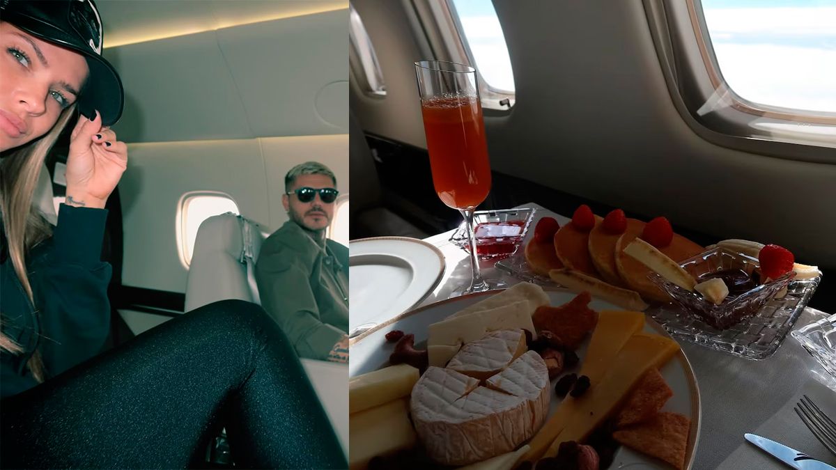En algunas de las postales, la actriz aparece junto a Mauro dentro de un avión privado, ambos vestidos en tonos oscuros. La China luce calzas brillantes y buzo negro con capucha, mientras que Icardi —con el pelo platinado y su look característico— posa con una campera verde militar. Otra de las fotos muestra la mesa servida durante el vuelo: un desayuno gourmet con pancakes, frutas, queso brie, frutos secos y jugo en copa de cristal, todo dispuesto junto a la ventana del avión con vista a las nubes.