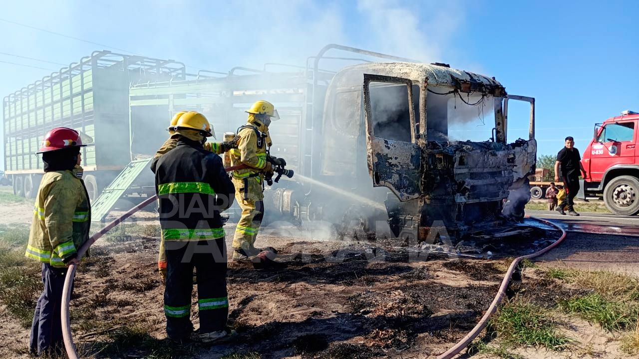 A pesar de la rápida respuesta del cuerpo de Bomberos Voluntarios de la Capital, el fuego destruyó totalmente la cabina del camión de transporte de ganado vacuno.