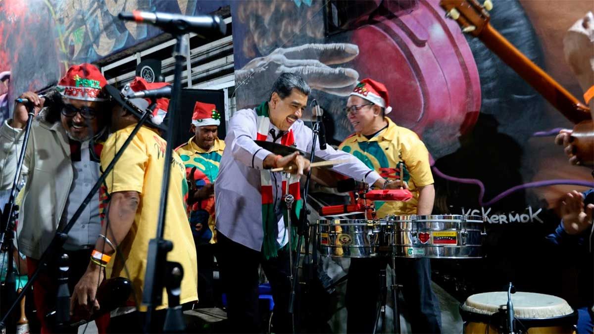 Con bufanda de Navidad al cuello y rodeado de música, el mandatario cantó, bailó, tocó el timbal y saludó a vecinos de la parroquia San Agustín, uno de los bastiones históricos del chavismo. Entre selfies y abrazos, un grupo musical puso el clima con gaitas, el género típico de las fiestas de fin de año en el país.
