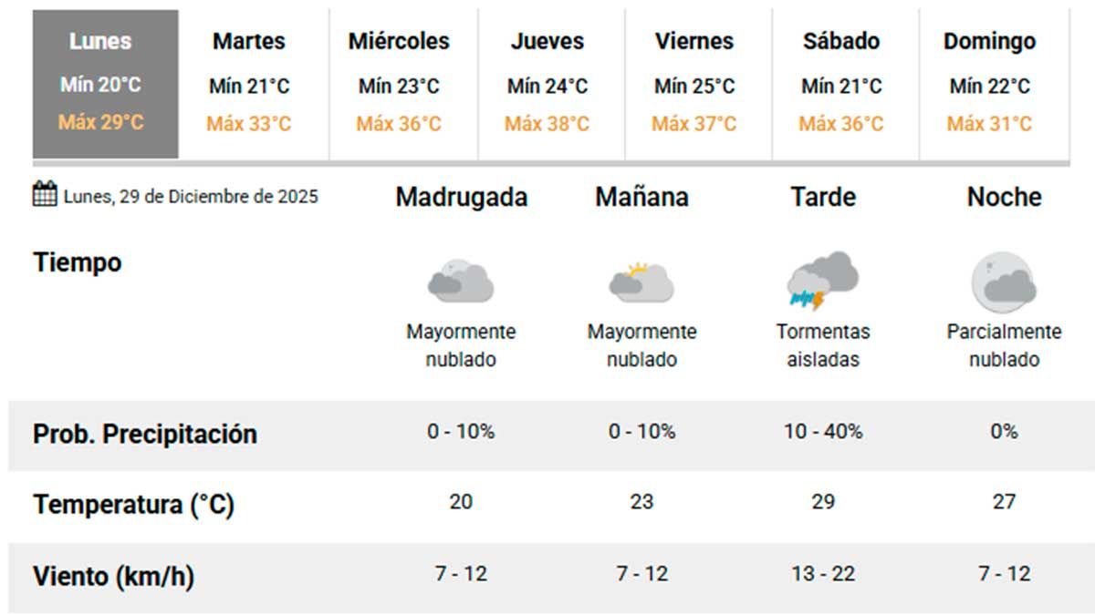En cuanto al pronóstico extendido, el organismo nacional indicó que para el martes 30 de diciembre se mantendrán condiciones similares, con temperaturas prácticamente sin cambios y cielo parcialmente nublado durante toda la jornada.