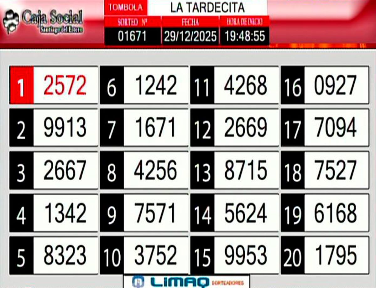 Este lunes 29 de diciembre, como todos los días, se llevó a cabo un nuevo sorteo de la Tómbola Santiagueña.