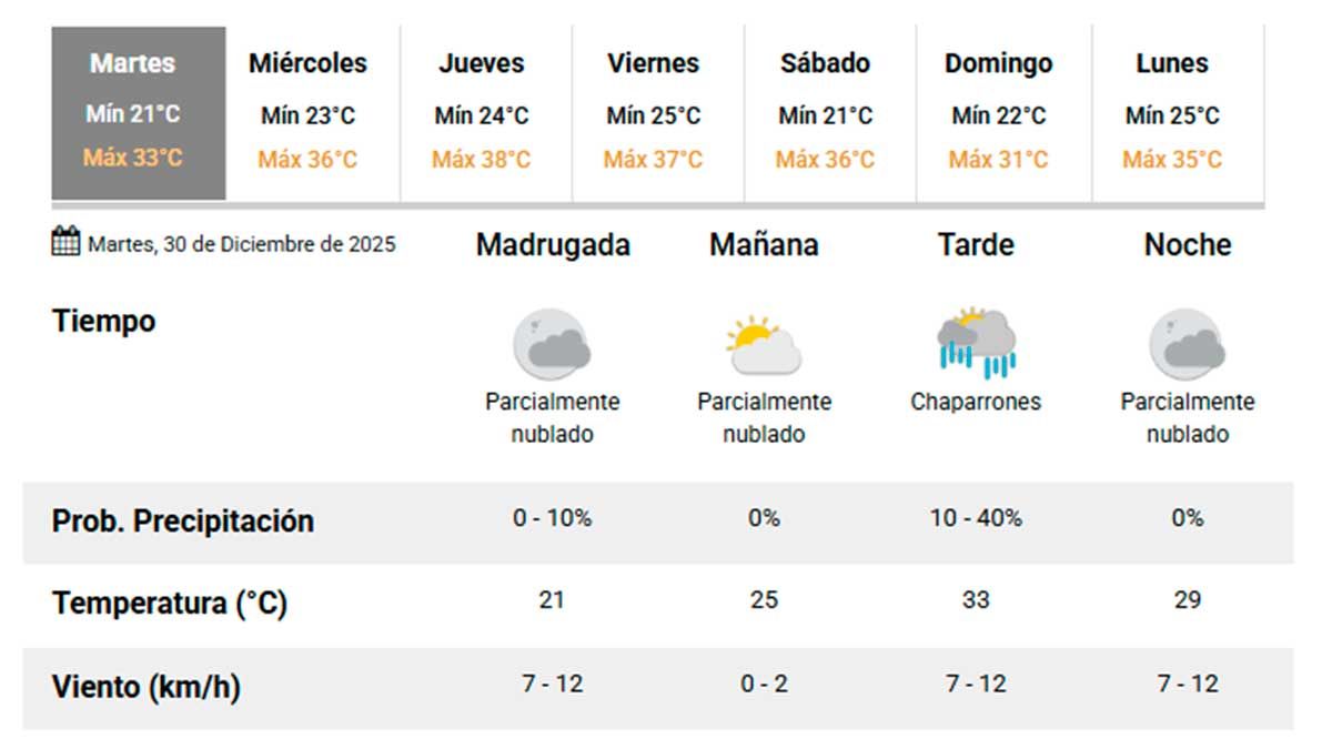 Según el Servicio Meteorológico Nacional, para este martes 30 de diciembre se espera una jornada con temperaturas elevadas, algo de nubosidad y baja probabilidad de chaparrones.