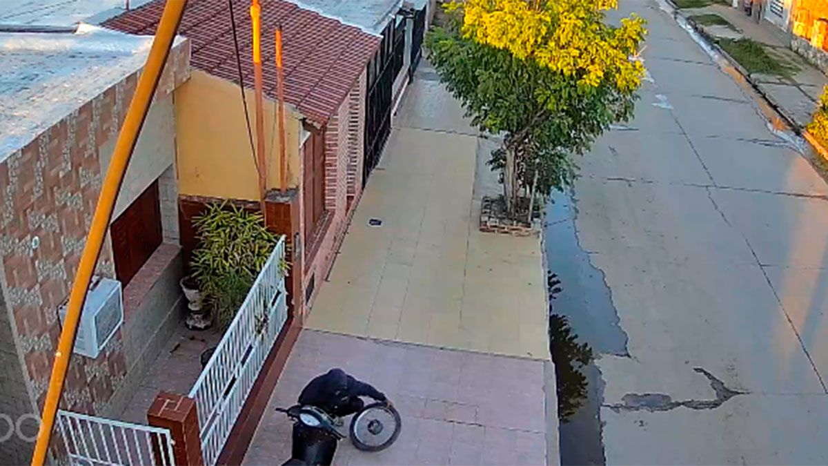 En las imágenes se observa a dos sujetos a bordo de un motovehículo. Mientras uno esperaba al mando del rodado y fingía hablar por teléfono, el cómplice descendió rápidamente, se dirigió a la moto de la víctima y, en cuestión de segundos, logró extraer la rueda delantera para luego darse a la fuga.