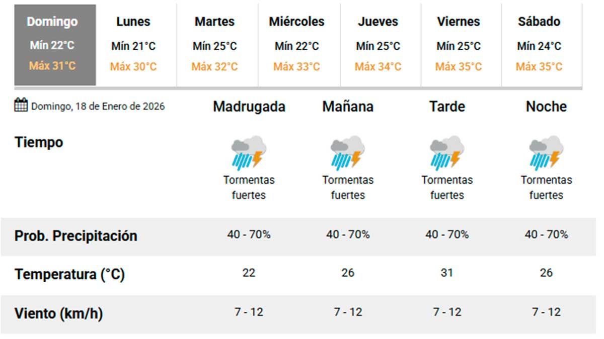 La jornada comenzará con cielo mayormente nublado, una temperatura mínima estimada en 22°C, elevada humedad —cercana al 93%— y viento leve del sector sudoeste. Durante la mañana se esperan tormentas con probabilidades de precipitación que oscilarán entre el 40% y el 70%.