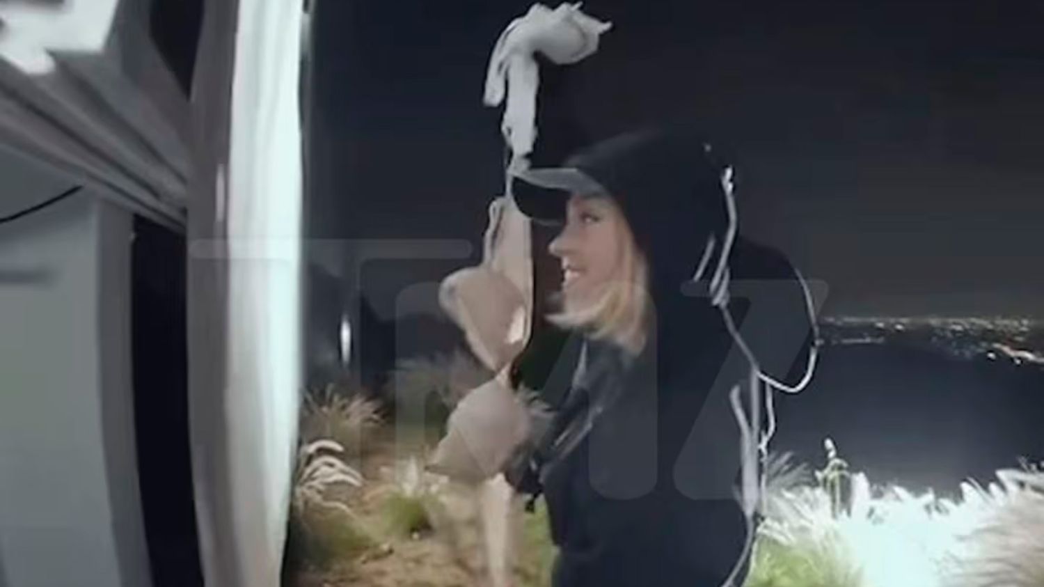 De acuerdo a las imágenes a las que accedió TMZ, la actriz escaló la letra “H” del conocido símbolo del espectáculo mundial. Junto a varios “alpinistas” subió hasta allí y colocó las prendas entrelazadas una detrás de otra.