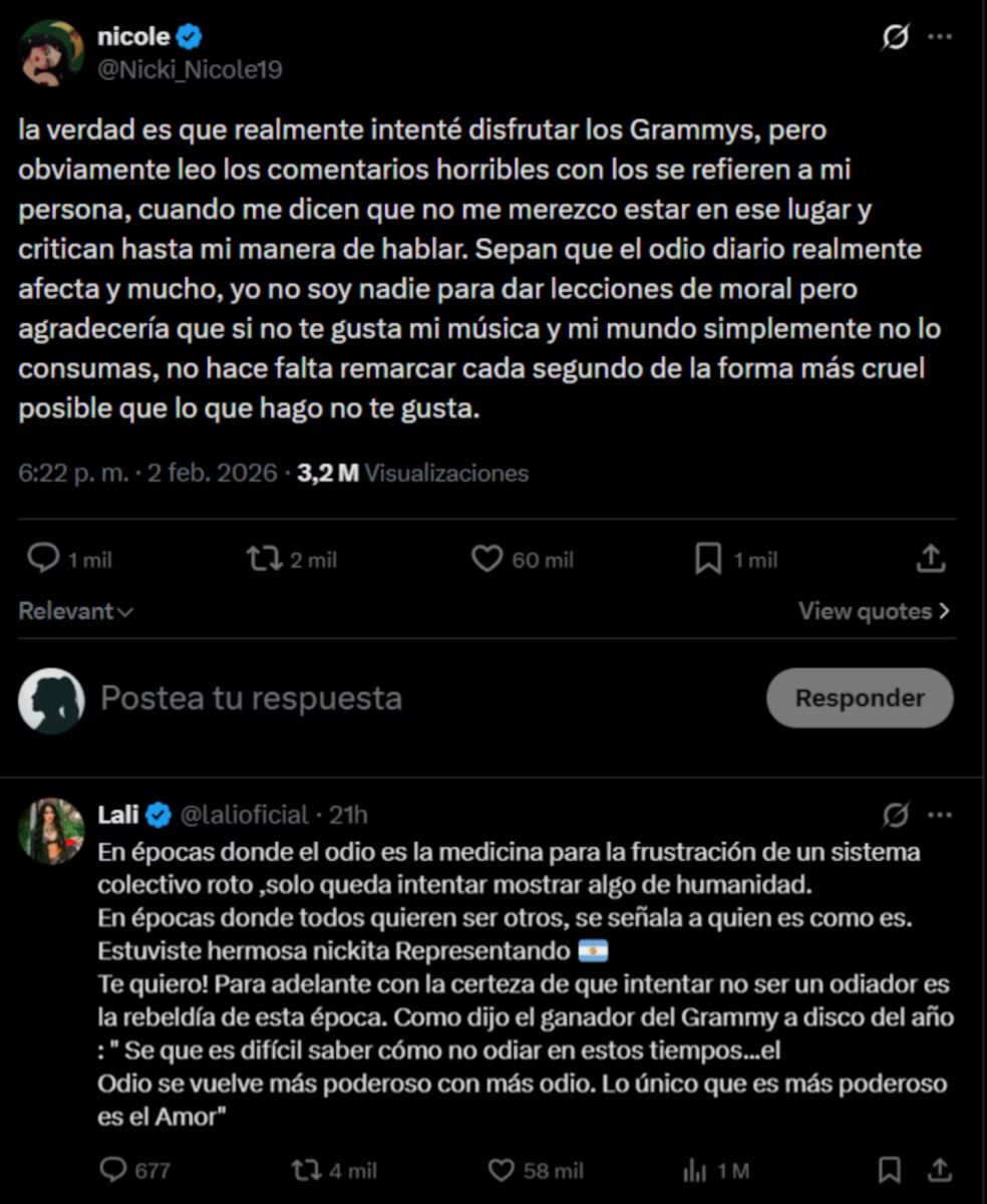 Lali Espósito expresó públicamente su apoyo a Nicki Nicole luego de la ola de críticas que la cantante rosarina recibió en redes sociales tras su participación en los Premios Grammy, donde fue la única mujer argentina nominada en esta edición.