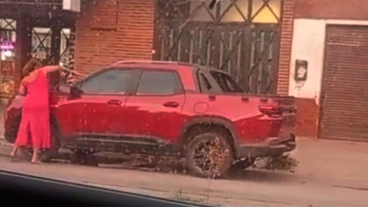 Las grabaciones muestran a la mujer visiblemente alterada, descalza y con un martillo en la mano, caminando alrededor de una camioneta roja estacionada sobre la vía pública. En las imágenes se la observa intentando provocar daños en distintos sectores del rodado y, finalmente, descargando varios golpes sobre el parabrisas, que terminó con abolladuras visibles. También se registraron daños en los espejos laterales del vehículo.