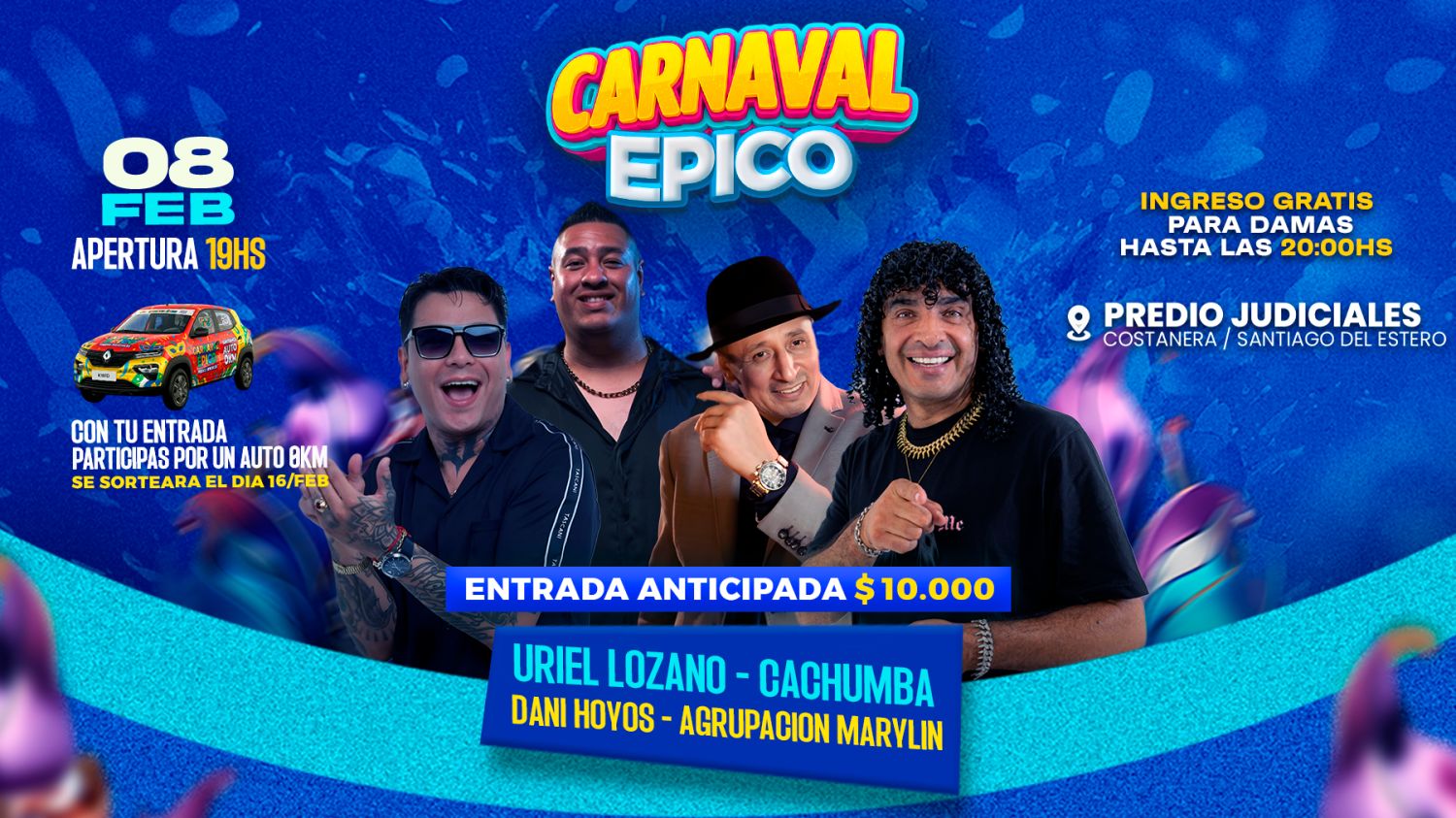 Carnaval Épico contará con una potente grilla artística encabezada por Uriel Lozano, Cachumba, Dani Hoyos y Agrupación Marilyn, referentes indiscutidos de la música tropical y popular, que harán vibrar al público durante toda la noche. La propuesta se completa con la participación de otros artistas invitados, en un espectáculo pensado para todos los gustos.
