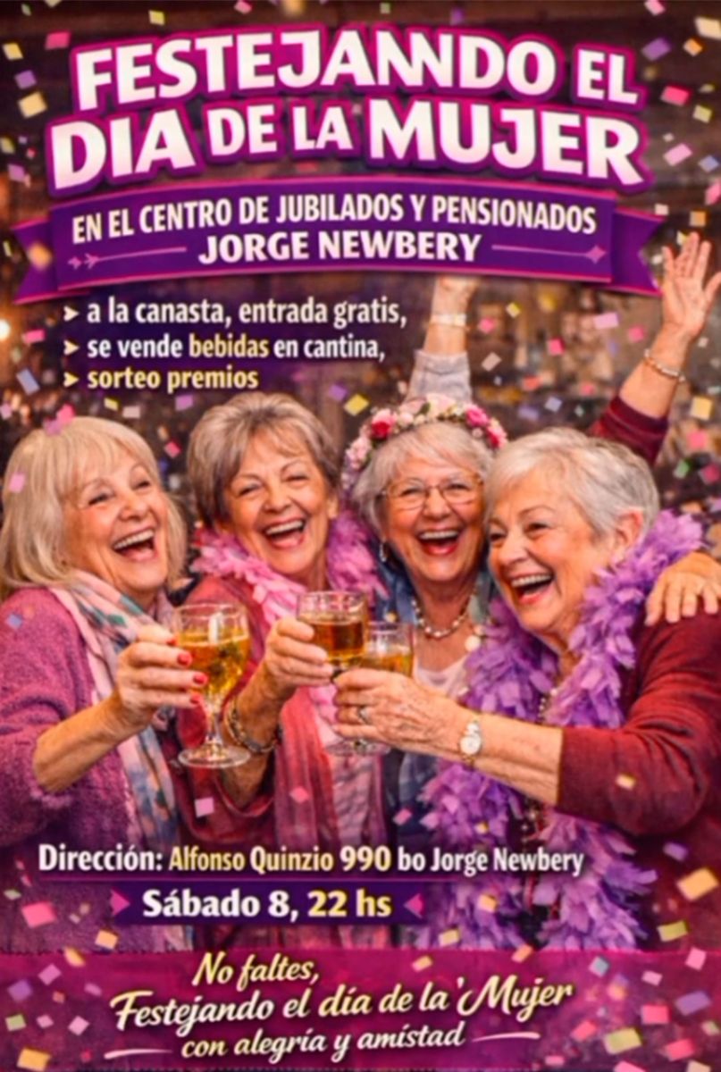 El Centro de Jubilados y Pensionados “Jorge Newbery” organizará este sábado una celebración especial para conmemorar el Día Internacional de la Mujer, con una propuesta pensada para compartir una noche de alegría, amistad y encuentro.