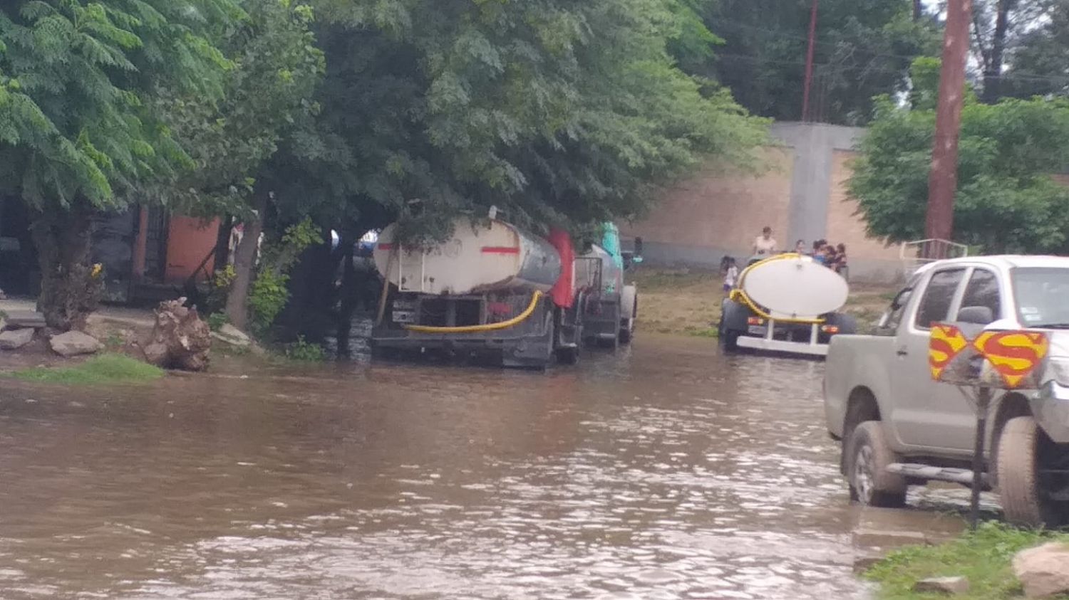 Personal de Defensa Civil y distintas áreas del municipio trabajan con bombas y camiones cisterna para retirar el agua acumulada tras las lluvias.