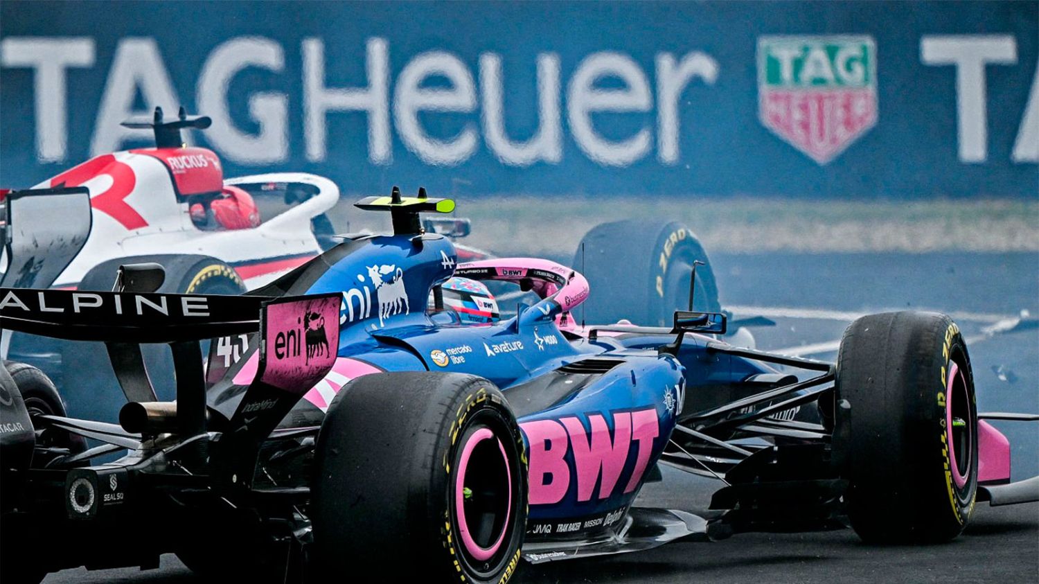 Ocon quiso superar al argentino mientras salía de boxes en una zona sin espacios y ambos terminaron haciendo un trompo. Mirá el video.