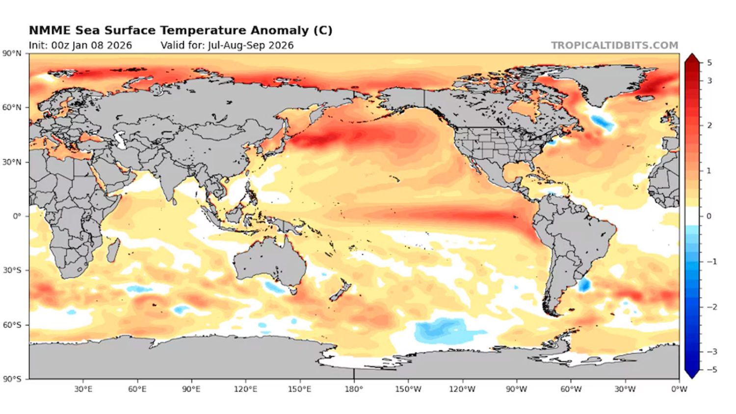Las últimas proyecciones muestran que hacia la primavera de 2026 el calentamiento en la región Niño 3.4 podría superar los +2°C, lo que ratifica la hipótesis de un evento excepcionalmente intenso.
