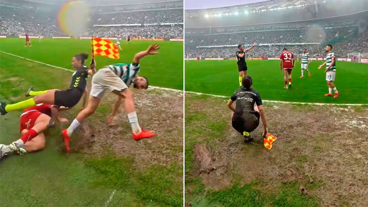 La reacción de los futbolistas fue inmediata en la búsqueda de la pelota, pero ninguno se detuvo para asistir a la árbitra asistente. Tampoco se vio un gesto de disculpa o preocupación por parte del jugador del Mardin 1969, mientras que su rival aprovechó para quejarse por lo sucedido. El árbitro principal interrumpió el juego y se acercó a la línea para verificar el estado de salud de su colega, al tiempo que pidió explicaciones a uno de los jugadores involucrados en la acción.