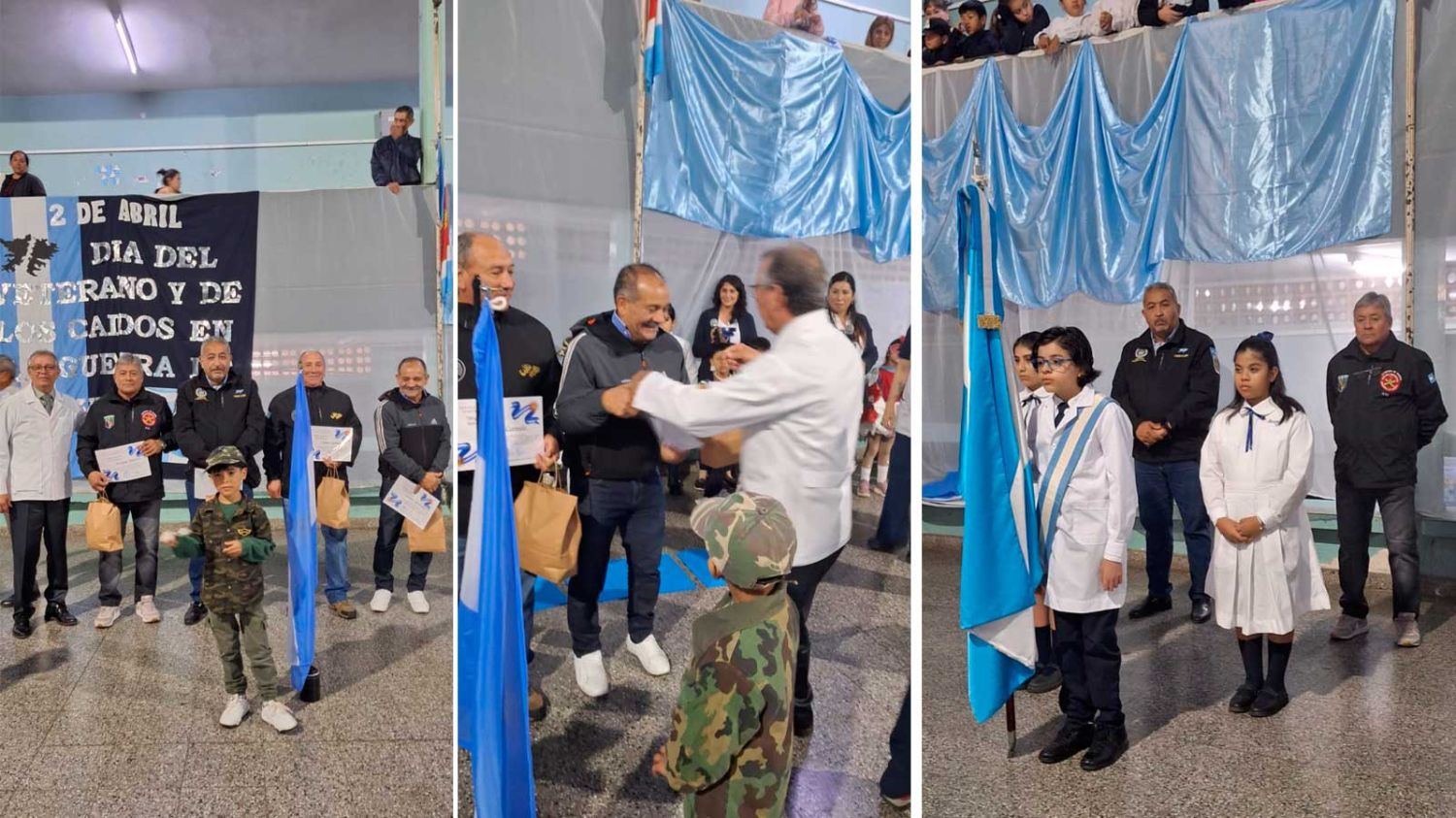 Como cierre del acto, la institución realizó la entrega de presentes a los excombatientes Antonio Vázquez, Carmelo Rolón, David Díaz y José Santillán, en reconocimiento a su valentía y compromiso, en una jornada que reafirmó la memoria y el respeto por la causa Malvinas.
