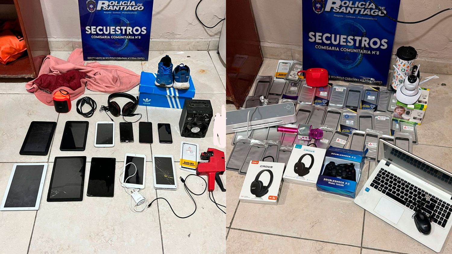 De inmediato, y en presencia de un testigo hábil, procedieron al secuestro de los elementos. Entre los bienes recuperados se encuentran una notebook marca Acer, un mouse, una plastificadora marca Global, dos parlantes bluetooth, dos auriculares marca Only, una cámara WiFi, un micrófono de karaoke, un joystick marca DoubleShock y 39 blindados para teléfonos de distintas marcas. También se incautaron celulares, tablets, prendas de vestir, calzado y otros accesorios electrónicos.