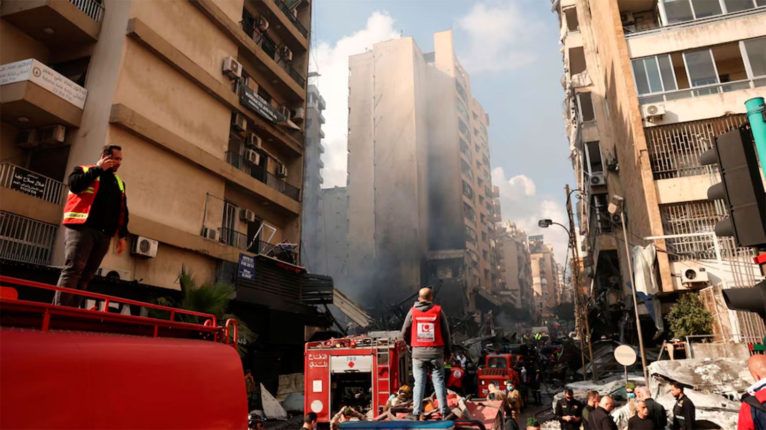 Periodistas de AP observaron cuerpos carbonizados en vehículos y en la calle en una de las intersecciones más transitadas de Beirut, en el barrio de Corniche al Mazraa, una zona mixta residencial y comercial. Edificios de apartamentos fueron alcanzados. Equipos de rescate utilizaron montacargas para remover escombros humeantes en busca de sobrevivientes.