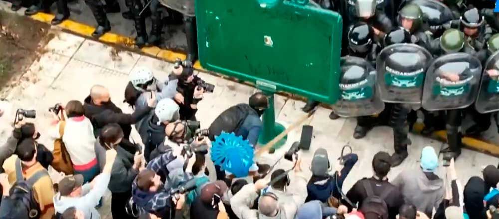 Los uniformados se encontraban apostados en Lima y Avenida de Mayo mientras aguardaban el avance de los activistas de Greenpeace, quienes intentaron ocupar y cortar el tránsito en la arteria de esa zona, motivo por el que se procedió a neutralizarlos y se registraron desmanes.