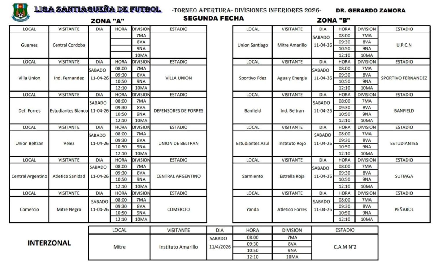 La Liga Santiagueña de Fútbol confirmó la programación de la segunda fecha del Torneo Apertura 2026 de divisiones inferiores, que se disputará íntegramente este sábado con partidos en las Zonas A y B, además de un cruce interzonal.