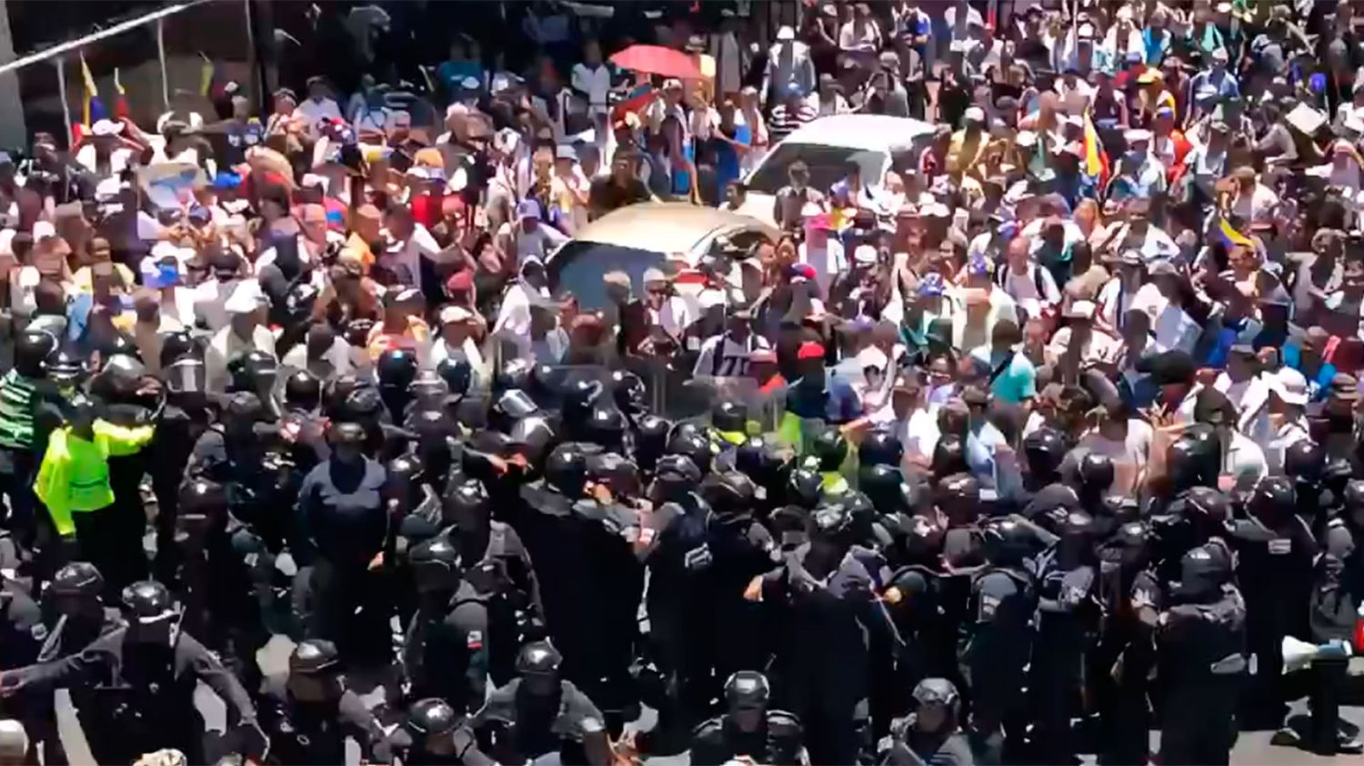 Decenas de agentes policiales antimotines los contuvieron con gases lacrimógenos y escudos en el centro de Caracas, a pocos kilómetros de la sede de gobierno.
