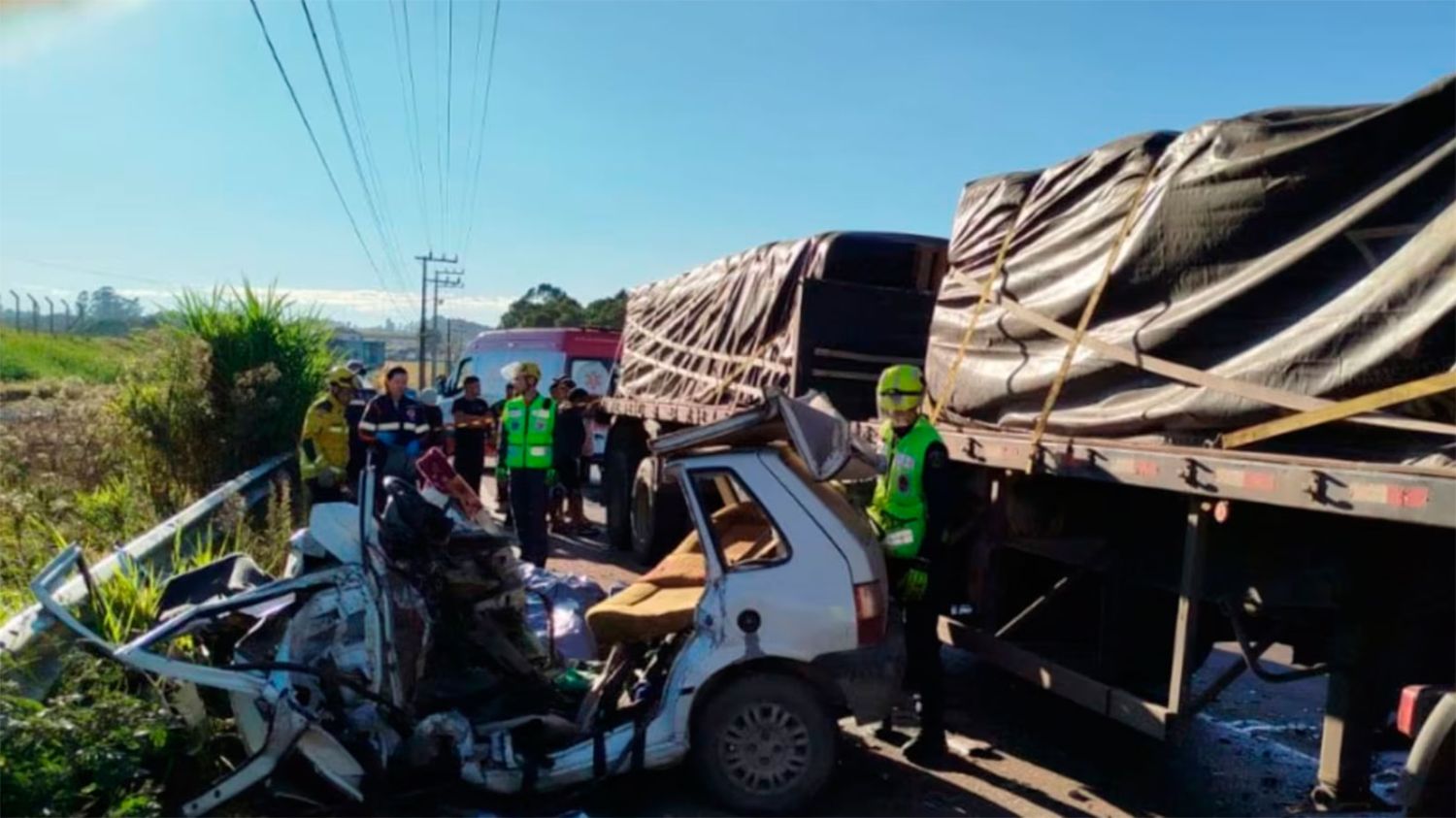 De acuerdo con la Policía Militar de Carreteras, el accidente ocurrió cerca de las 7, cuando el vehículo en el que iban las víctimas invadió el carril contrario después de realizar una maniobra de giro y terminó impactando frontalmente contra el transporte de carga.