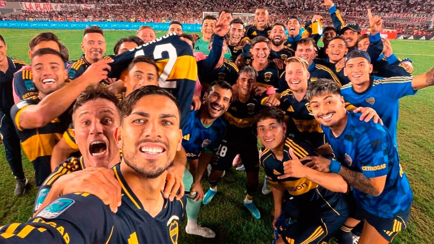 Incluso, entre los que celebraron se pudo ver a Edinson Cavani, que acompañó al grupo en un momento que quedará marcado en la memoria xeneize. Para cerrar la noche, el propio Paredes sacó su celular y se tomó una selfie histórica junto a todo el plantel, con las tribunas rojiblancas de fondo.