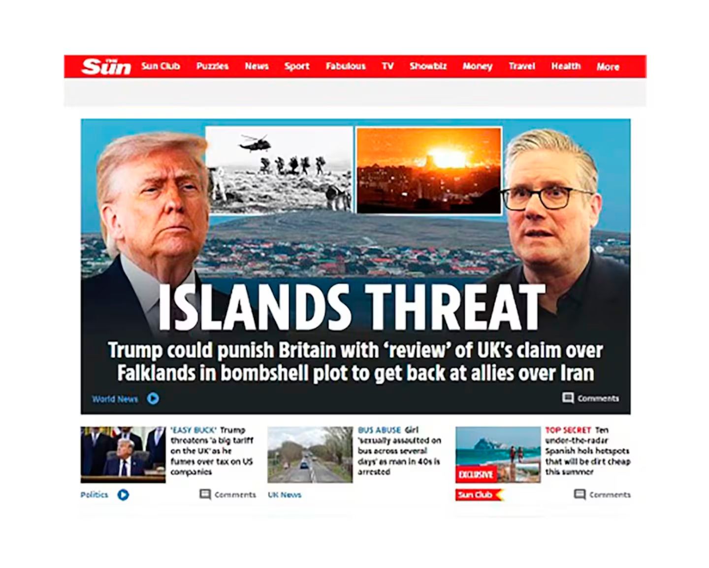 The Sun fue uno de los primeros en poner el tema en tapa: el diario informó que Donald Trump podría revisar la postura de Estados Unidos respecto a la soberanía británica sobre las Malvinas como represalia por la negativa del Reino Unido a permitir el uso de sus bases militares en el reciente conflicto con Irán.
