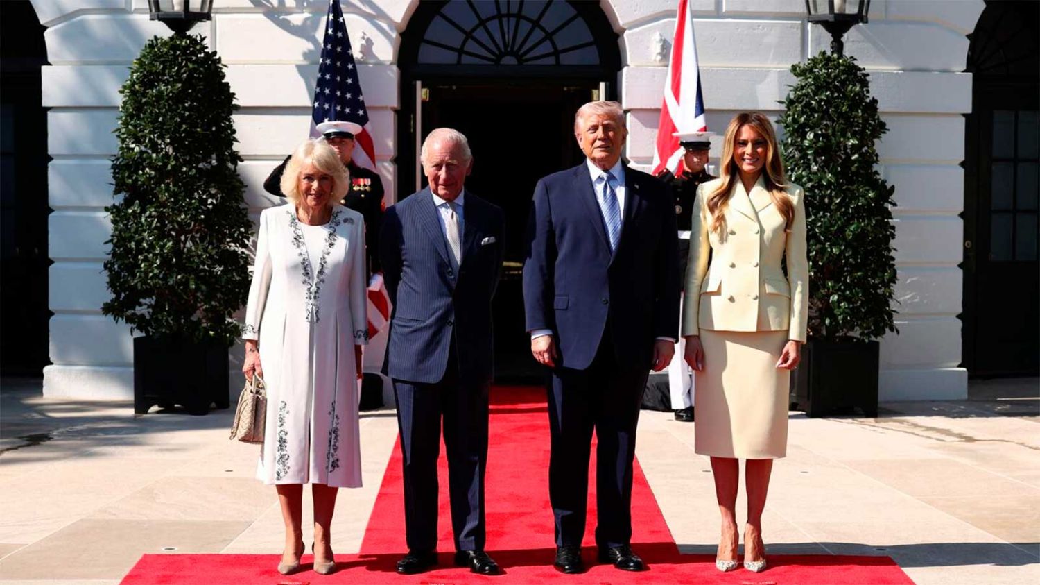 Luego del saludo inicial, Carlos III y Trump posaron junto a sus esposas para las cámaras. Melania Trump eligió un traje amarillo para la ocasión, mientras que Camila optó por un vestido de color claro.